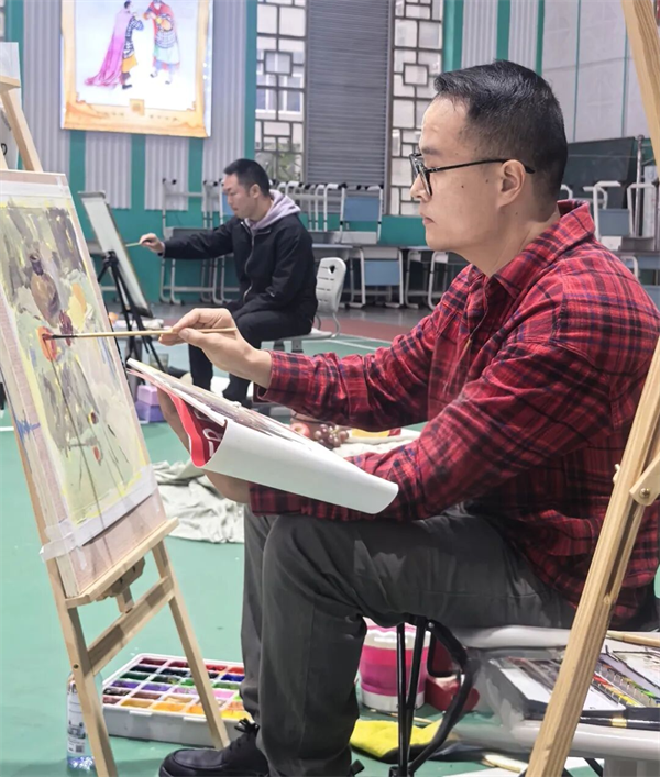 在融智堂内,国画人物创作区墨香四溢。教师们全神贯注,挥毫泼墨,以笔线勾勒人物神韵,用水墨渲染情感意境。宣纸之上,人物形象渐次生动,展现出南溪美术教师扎实的传统书画功底和对中国画笔墨精神的深刻理解。