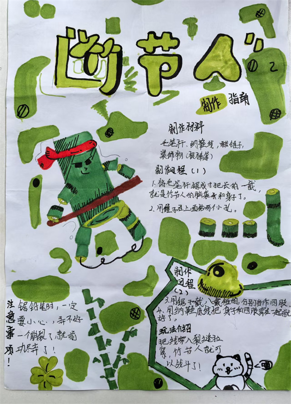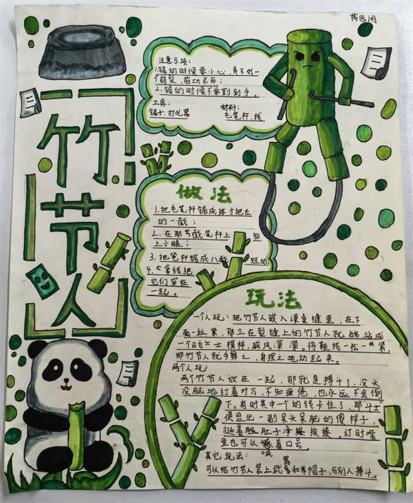 活动伊始,同学们首先完成了以“竹节人制作指南”为主题的手抄报设计。这些手抄报不仅版面设计精美,还详细记录了竹节人的制作方法和玩法。