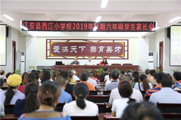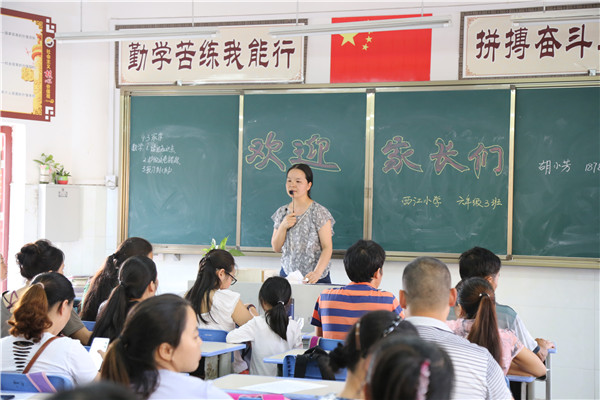 西江小学支部书记、校长钟益春代表学校感谢家长一直以来对学校的大力支持,然后向全体家长介绍了学校近几年来所取得的成绩,并且分析了目前学校的情况,特别是六年级的详细情况。重点阐释了学校的办学思想和办学特色,提出了学校发展规划和美好前景。