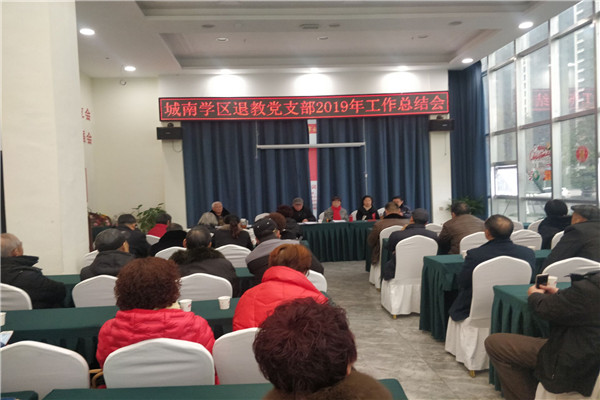 退教支部书记瞿泽树代表支部,对2019年度支部工作作了认真总结:一是介绍了退教支部的基本情况:共有党员61人,下设7个党小组;二是上级党组织对城南学区退教支部的关心,为提高管理效率,将原来的超大支部分解成了较小的支部;三是强化了退教支部组织建设,设立了7个党小组,建成了三级网络平台,健全了组织信息,使信息更为通畅;四是全力推进城南退教支部“两学一做”常态化制度;五是管好用好有限的活动经费;六是围绕“中心”,服务大局,积极开展丰富多彩的支部活动。