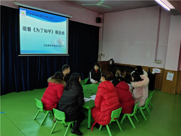 近日,江安县怡乐镇中心幼儿园组织全体教职员工及党员干部观看大型电视纪录片《为了和平》的活动。