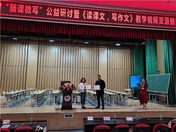 活动最后,四川新创教育研究院常务副院长裴富强代表课题组向宜宾市几十所学校无偿地捐赠了《读课文,写作文》视频课资源,宜宾市教科所小学语文研训员袁雪虹老师代表宜宾市全体受赠学校接受捐赠并发表讲话。