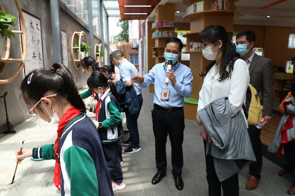 参观完艺术馆后,李江领着客人们走进开放式图书馆“一起阅读吧”,正值课间,“一起阅读吧”和书法长廊里好不热闹,学生或静静阅读,或在水写台上挥毫泼墨,尽情书写。