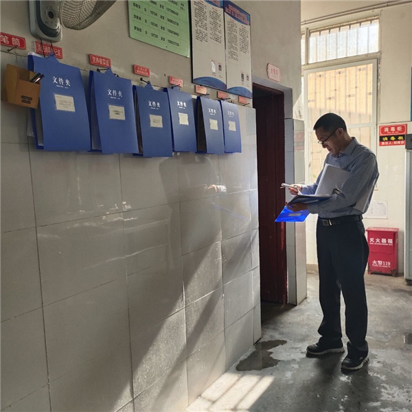 魏显勇一行查看了学校营养餐管理制度、学校食品安全管理制度的落实情况,同时查看了食堂餐饮服务许可证、炊事员健康证、食堂的环境卫生、食品原材料的进货渠道、进货台账、索票等;并对餐具清洗、消毒情况、食品留样、灭火器进行了仔细的检查。