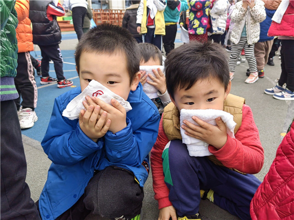 随着幼儿园内一阵急促的警报声,消防疏散演练正式开始。各园区幼儿在老师的引导下,弯着腰、用湿毛巾捂住口鼻,分两路纵队沿着墙壁栏杆从各个楼梯迅速且有序下楼,各班级从规定的安全出口迅速撤离,每个疏散通道的出口,都有指定的后勤人员进行组织疏导,协助幼儿安全撤离。到达指定地点后,孩子们排成四路纵队集中在一起,各班教师清点好人数后向指挥官报告。演练后,指挥官对本次消防演练进行了总结。