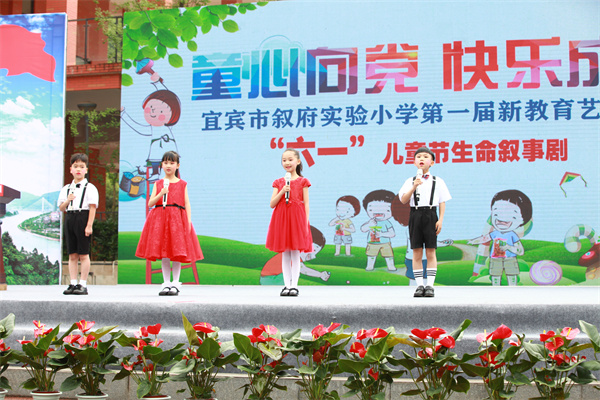 叙府实验小学自2015建校以来就致力于儿童戏剧表演项目的实践研究和深耕。每年的“六一”就是该校的戏剧文化节,为期三天的戏剧展演给每一个孩子都搭建起了演绎生命成长的舞台。除此以外,孩子们用每周的旗台和每期的期末庆典展示戏剧成果。学校班班有班本戏剧,人人上场,个个展示,学生全面、全程、全员参与。学校先后演出了戏剧100多场,创编和二度创作经典剧目100多部,内容涉及童话剧、课本剧、校园短剧、音乐剧、儿童现代剧等,其中童话剧《丑小鸭》2015年同俄国音乐家们同台展演,课本剧《小蝌蚪找妈妈》获得宜宾市戏剧表演二等奖,校园红剧《王二小》《红岩》等剧多次参加市区活动展示。2017年该校儿童生命叙事剧课程获得全国新教育实验十佳卓越课程奖。