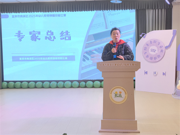 比赛尾声,评委专家结合赛事表现展开专业且深入的点评。宜宾市工业职业技术学校学前教育专业部主任严钘立足幼教实践,着重强调幼儿教师弹唱需兼顾“专业性与童趣性”,建议在演唱表现力、伴奏编配中贴合幼儿认知特点,让音乐成为师幼互动的纽带。