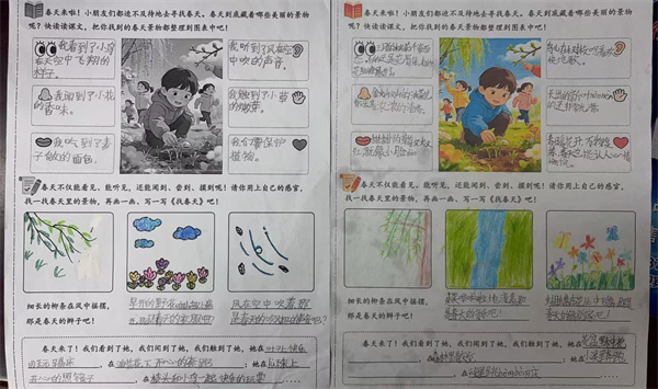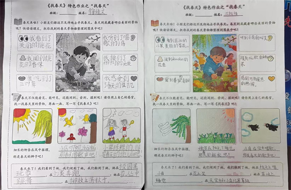 桃花树下,笔尖在纸上沙沙作响,有的同学把春天的粉色、黄色、绿色,都写进了小小的本子里,有的同学站在金色的油菜花海中,找到了春天最灿烂的颜色!有的同学在小区种植角,轻轻托住新生的草莓花,温柔地触摸春天的生命力,将春天捧在掌心里。同学们将嫩绿的小草、小鸟的歌声、桃花的香气、草莓的酸甜等发现,认真记录在特色作业单上,并模仿课文句式写下“粉红的桃花绽放,那是春天的笑脸吧!”等充满童趣的句子,配上自己的绘画作品。