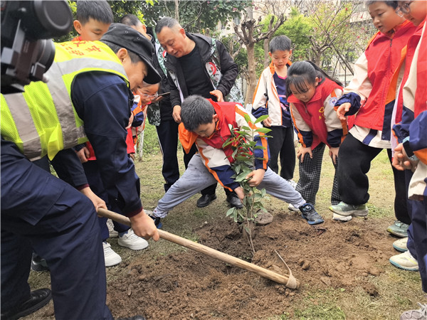 活动现场,队员们在社区志愿者和老师的指导下,朝气蓬勃、干劲满满。大家分工协作,有的挥锹挖坑,有的扶苗培土,有的提桶浇水,每一个步骤都做得认真细致。同学们稚嫩的脸庞上满是专注与期待,亲手将小树苗栽进土里,也把绿色希望播撒在心田。